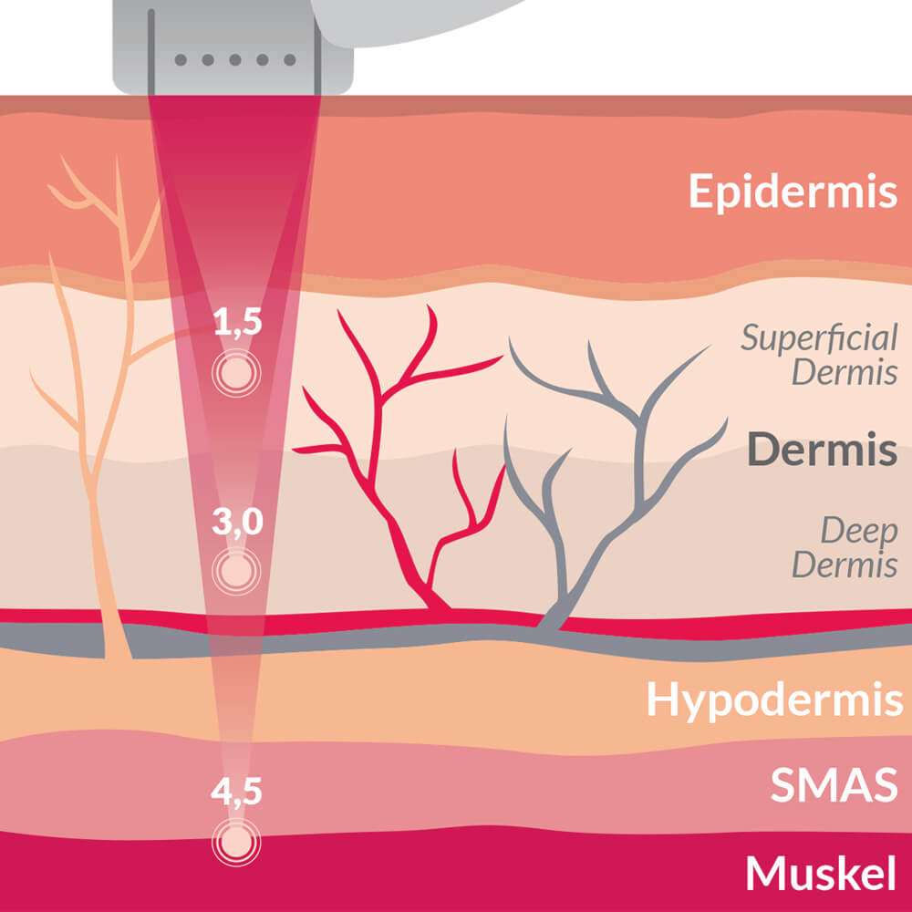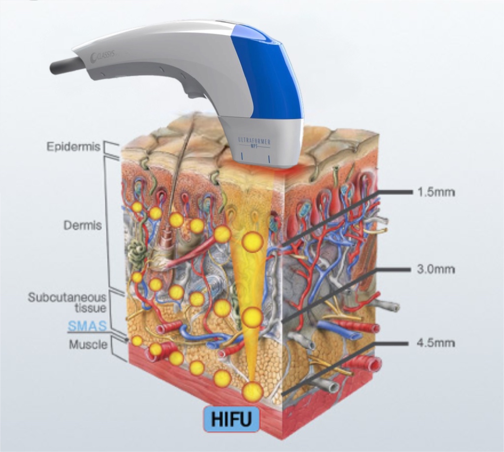 - Precise HIFU energy reaching up to 4.5 mm depth (SMAS layer)